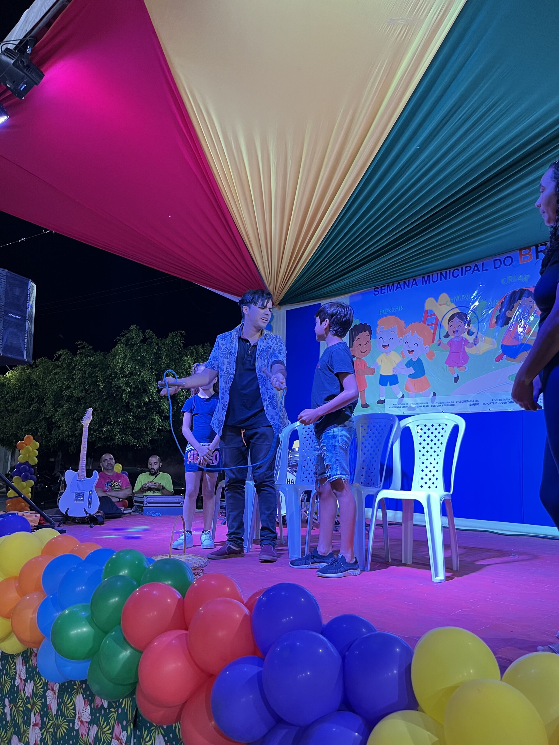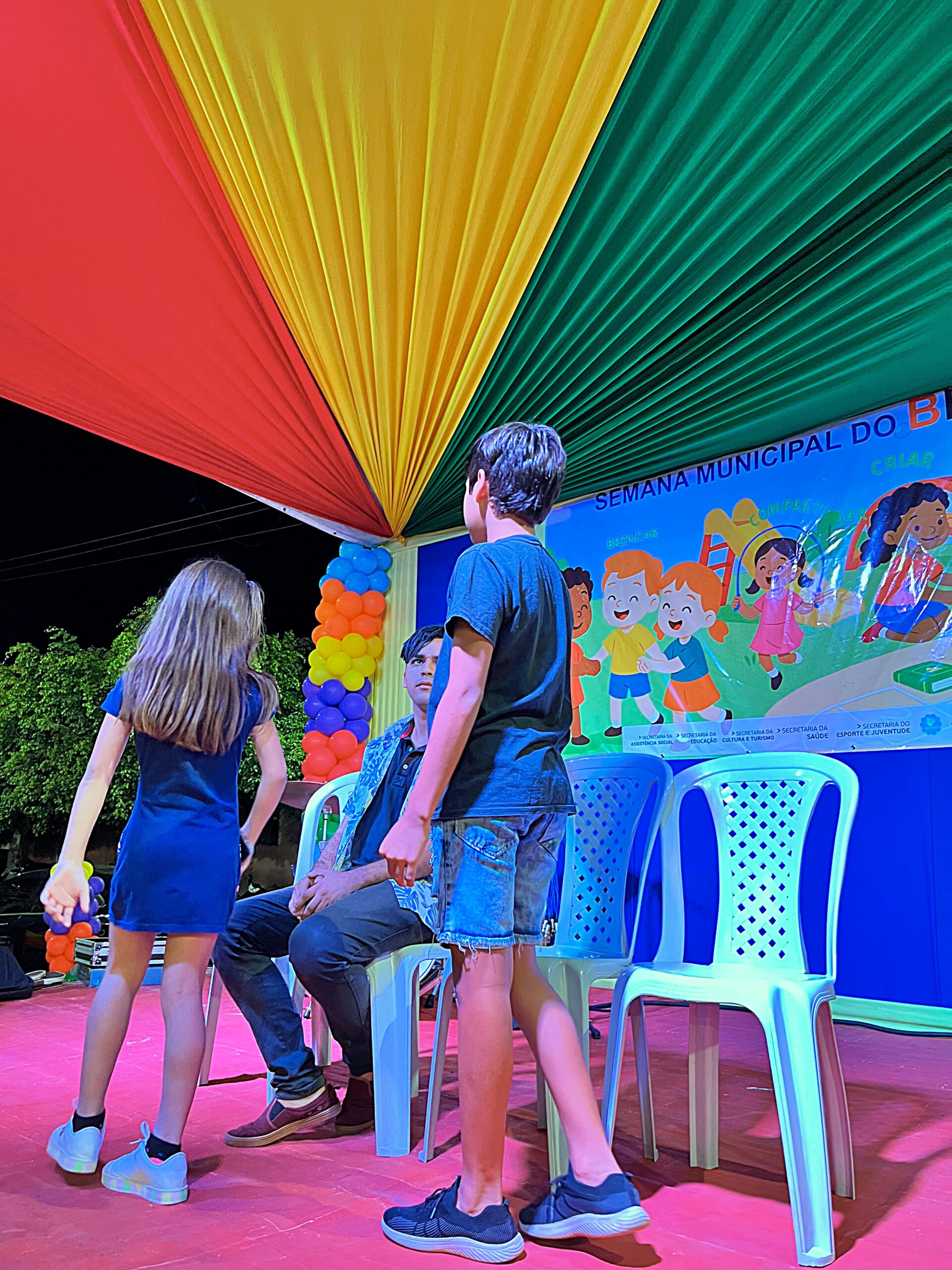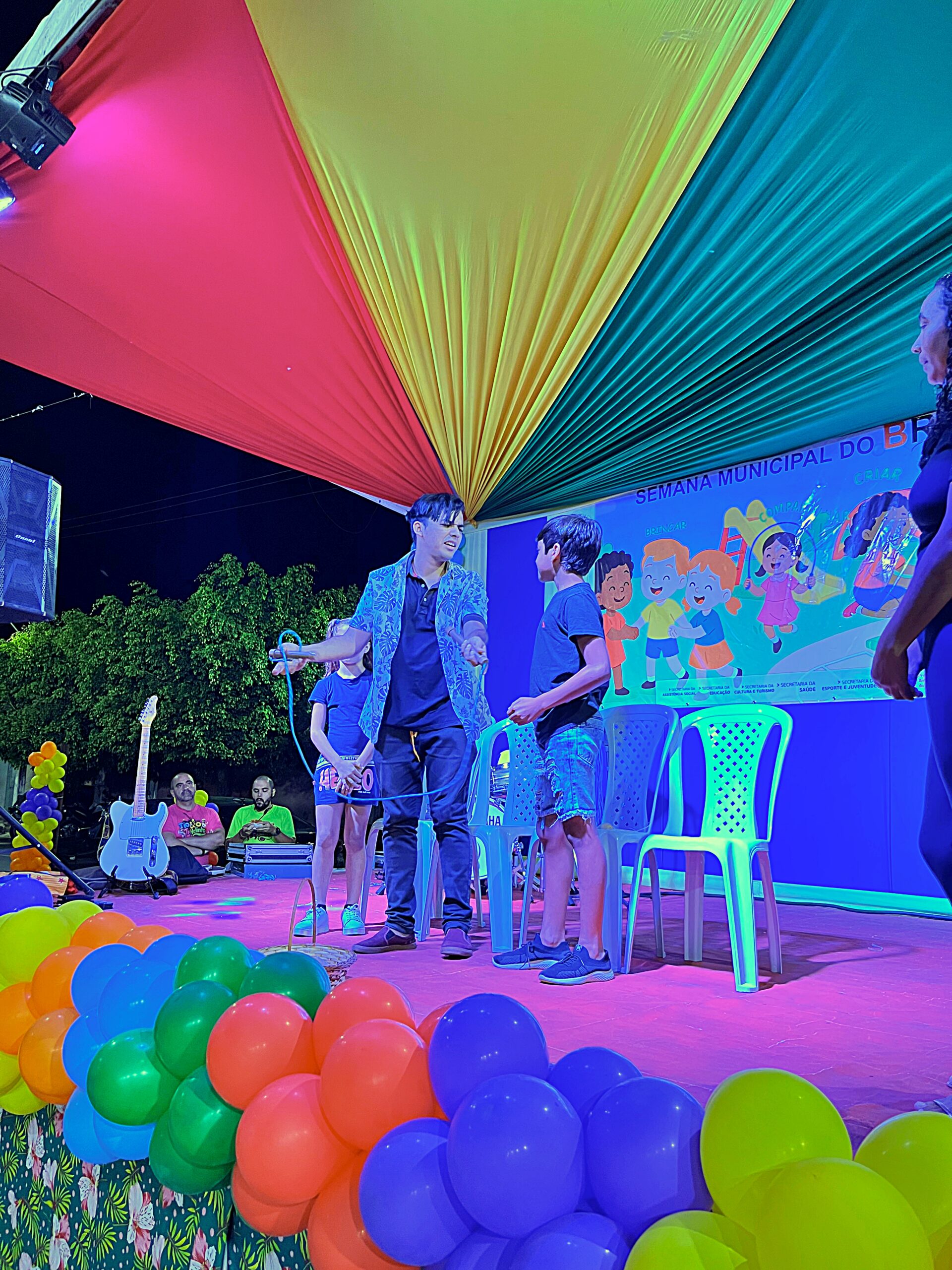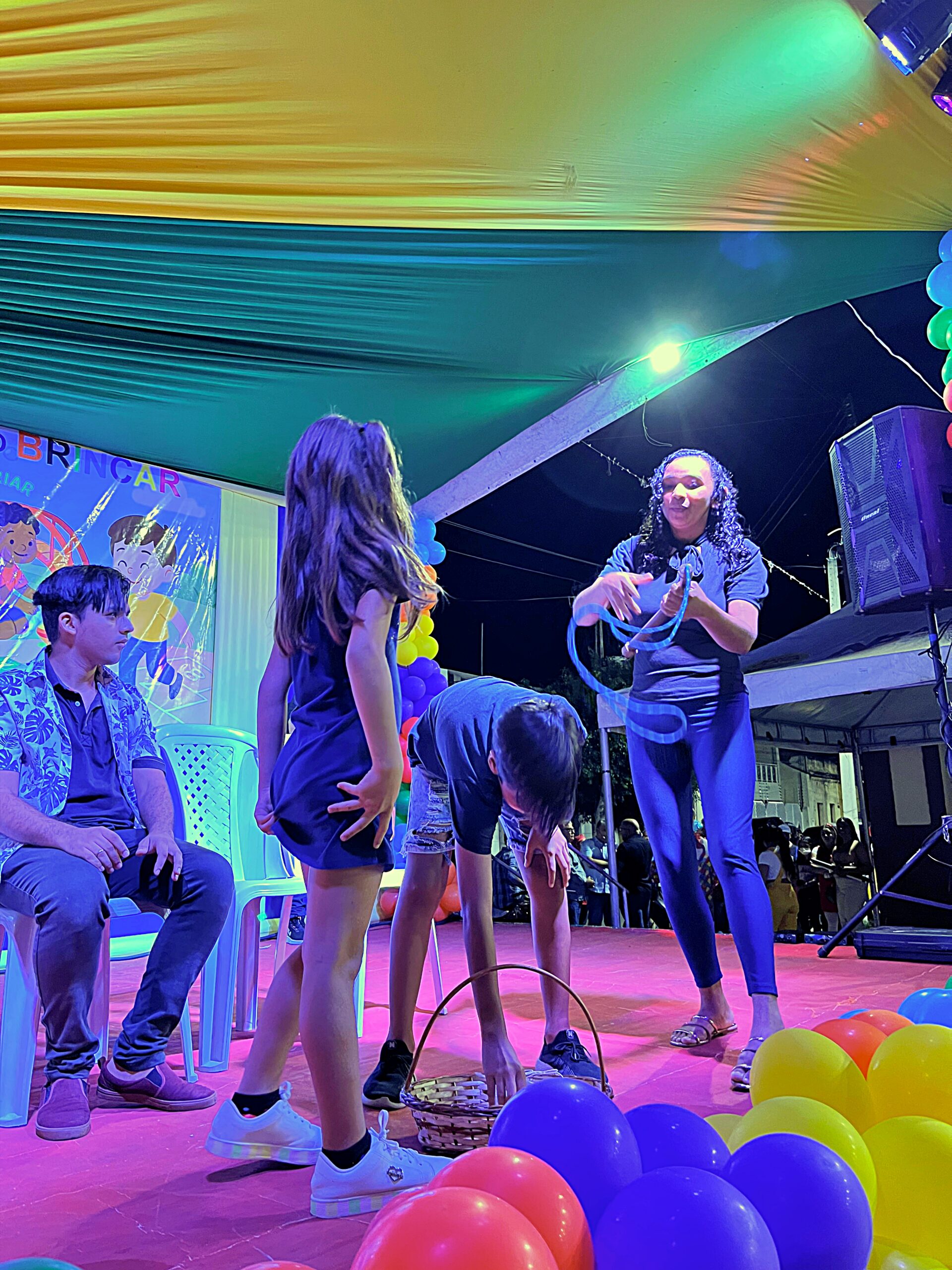 A magia tomou conta da praça com a presença animada do trio mais divertido da cidade: Tio Léo, Tio Helinho e Tio Sussu, que colocaram todo mundo para dançar, cantar e, claro, brincar! Crianças, pais e educadores participaram ativamente, transformando a noite em uma grande celebração ao direito de brincar e à importância da infância.