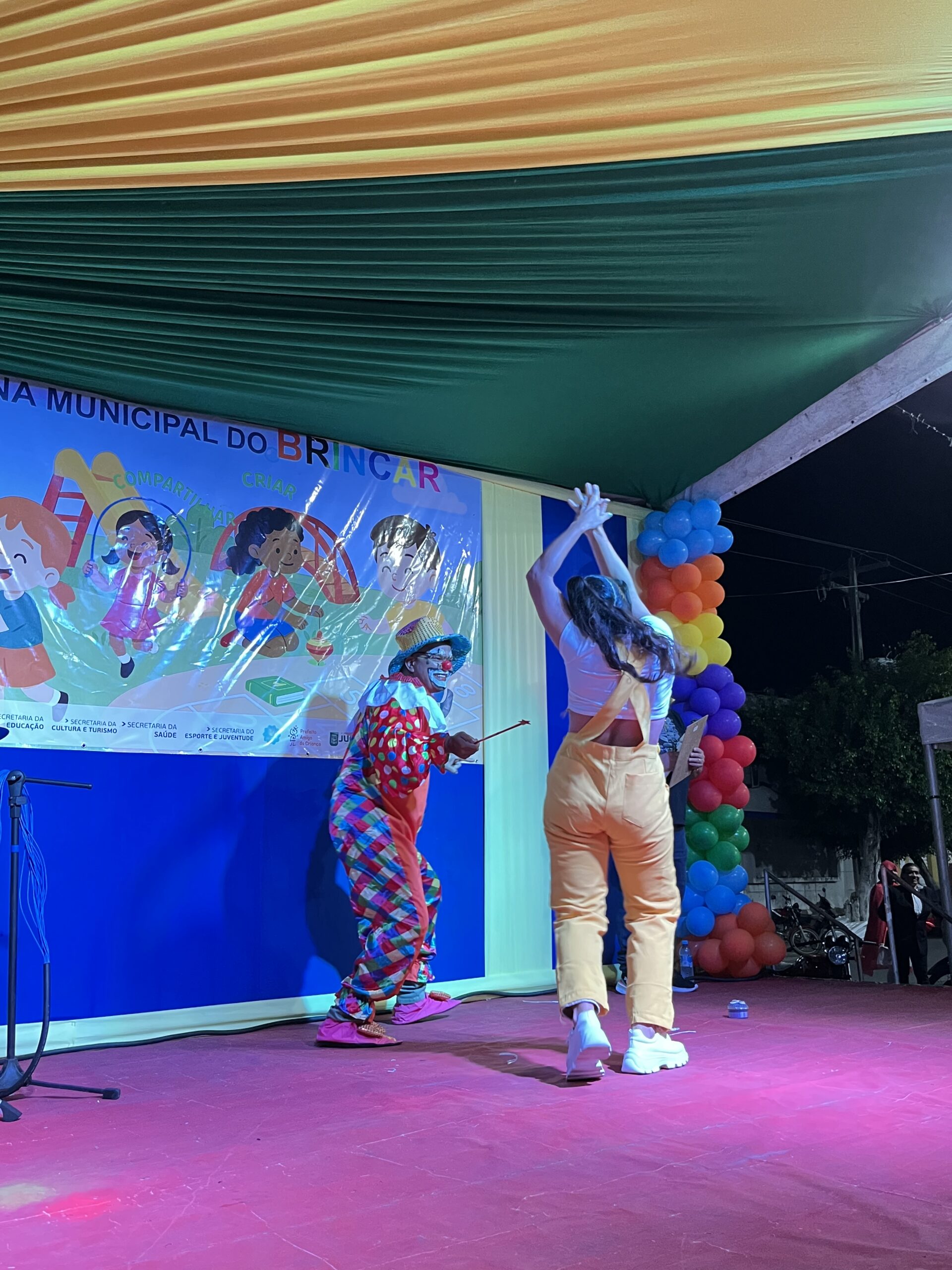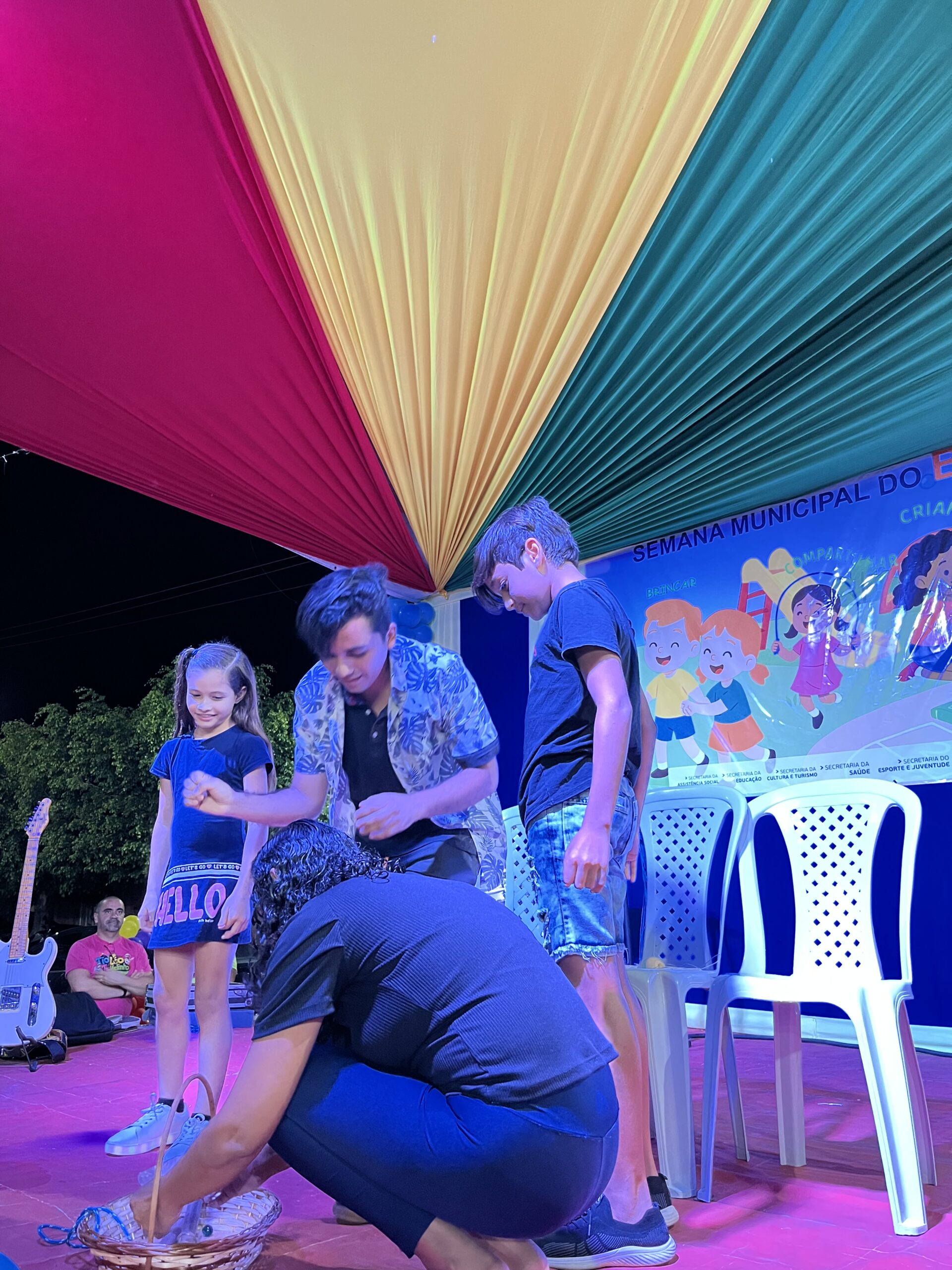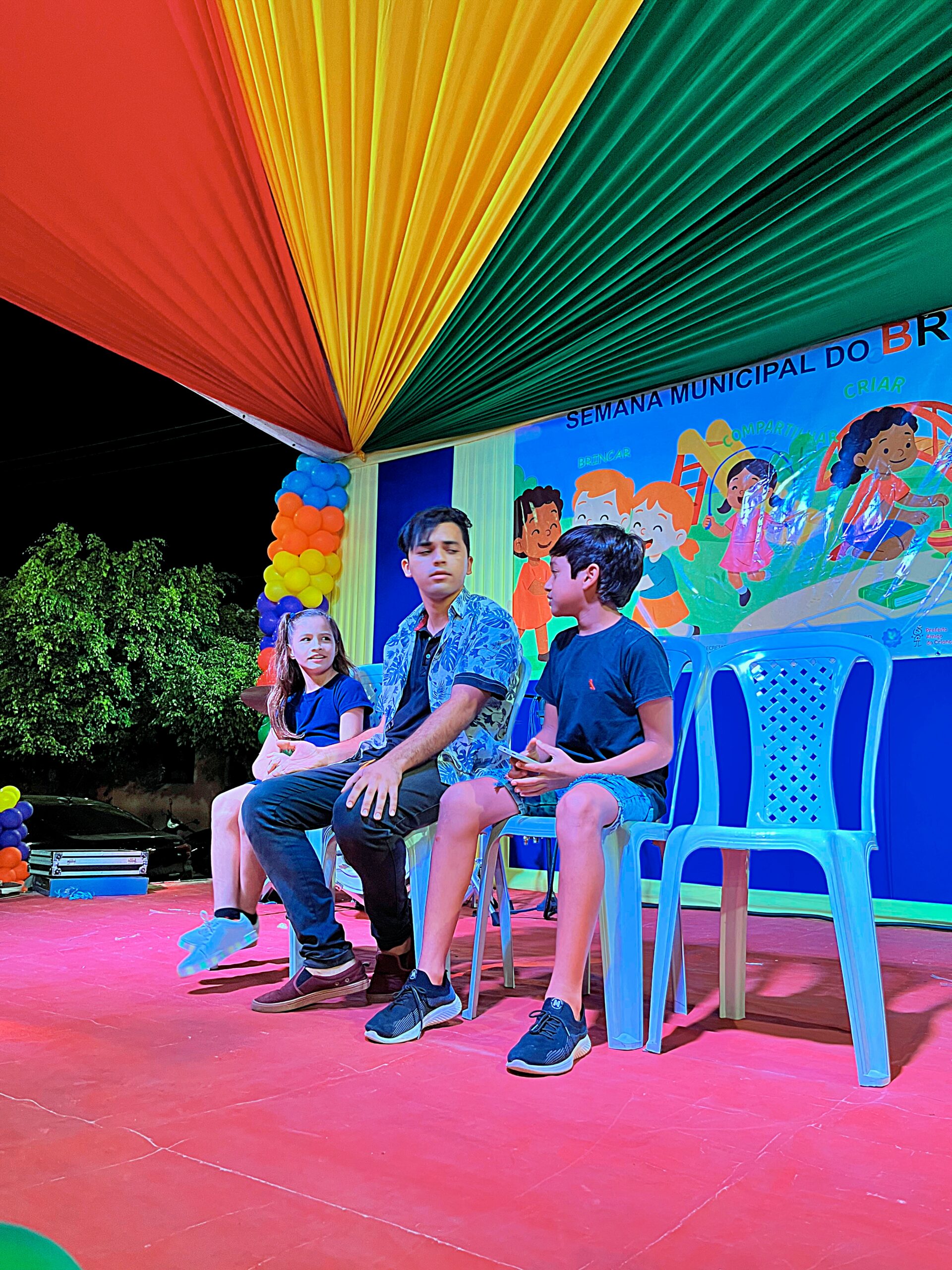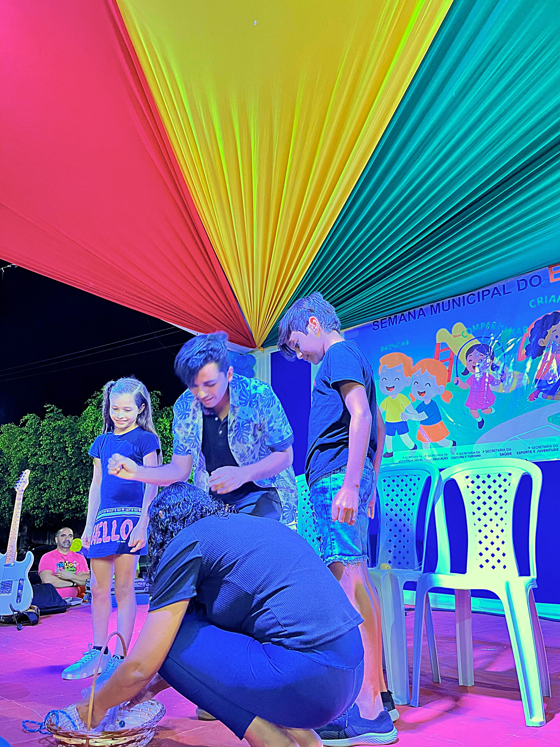 A magia tomou conta da praça com a presença animada do trio mais divertido da cidade: Tio Léo, Tio Helinho e Tio Sussu, que colocaram todo mundo para dançar, cantar e, claro, brincar! Crianças, pais e educadores participaram ativamente, transformando a noite em uma grande celebração ao direito de brincar e à importância da infância.